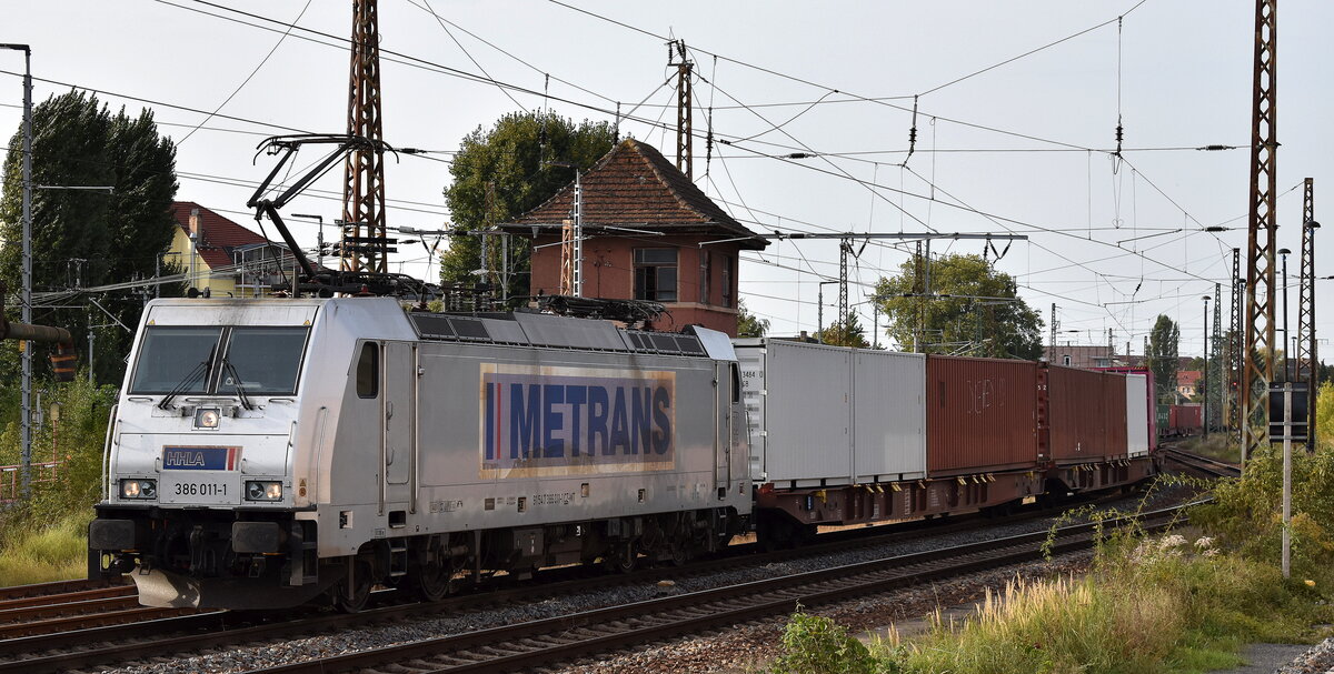 METRANS Rail s.r.o., Praha [CZ] mit ihrer "386 011-1" [NVR-Nummer: 91 54 7386 011-1 CZ-MT] und einem Containerzug Höhe Bahnhof Frankfurt (Oder) am 11.10.23