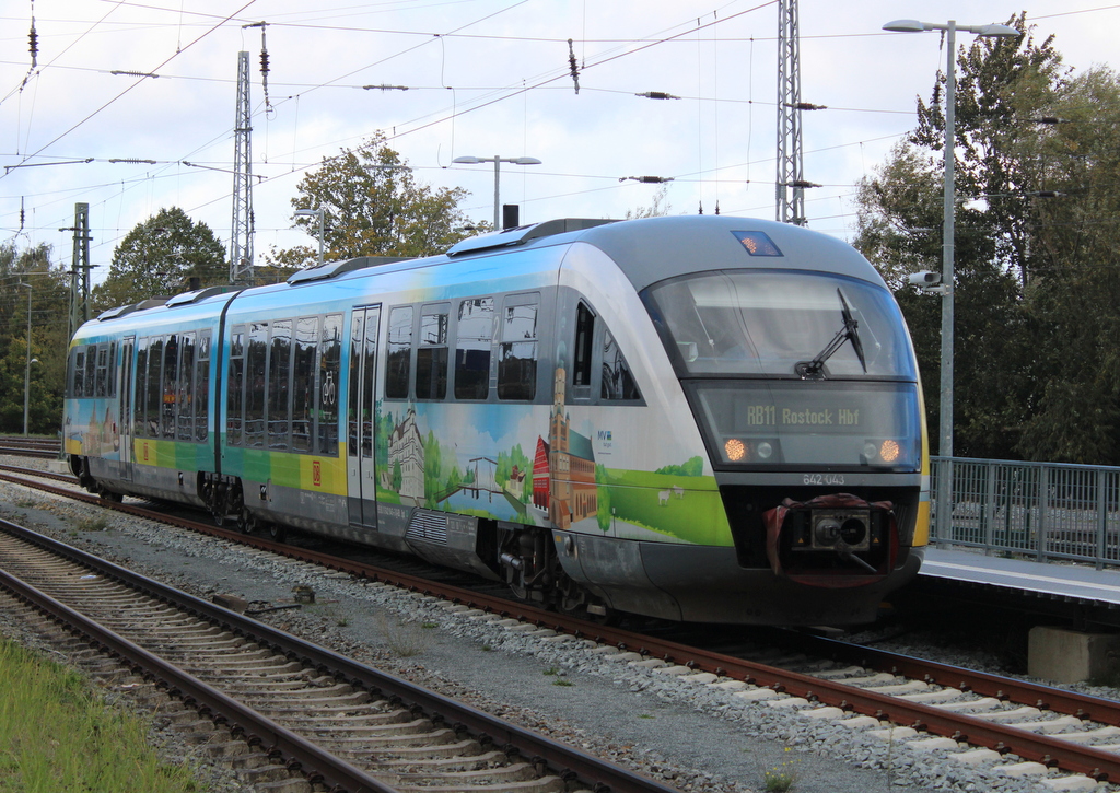 MV Design 642 043 als RB 11(Wismar-Rostock)am 14.10.2023 bei der Einfahrt im Rostocker Hbf.