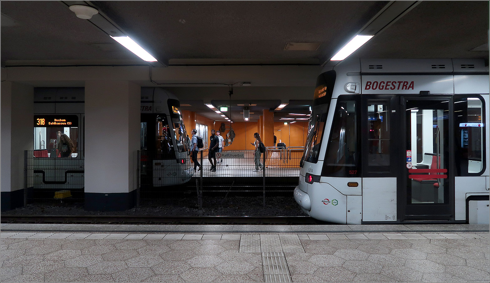 Die erste Tunnelachse in Bochum - Die U-Station Hauptbahnhof der Linien 308/318 und 306/316 hat Seitenbahnsteige. Die Linien 306/316 aus Wanne-Eickel wurden mittels eines neuen Tunnelabzweiges 2006 an den Tunnel angeschlossen. Die beiden anderen Bochumer Tunnelachsen liegen eine Ebene tiefer in einer viergleisigen Doppelstation. 22.08.2023 (M)