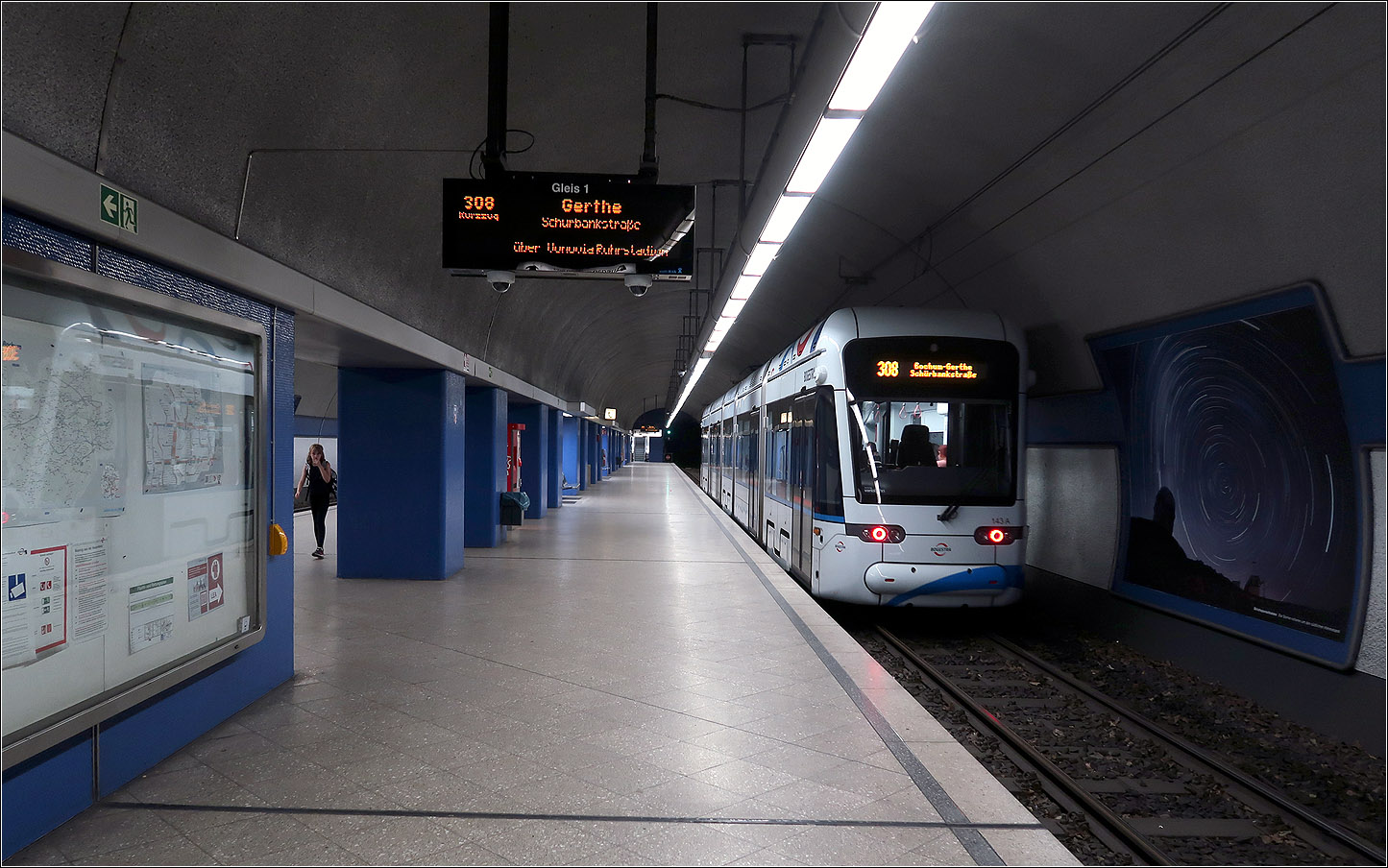 Die erste Tunnelachse in Bochum - !981 wurde die Tunnelstrecke vom Hauptbahnhof über die U-Haltestelle Planetarium zu einer Rampe am Ruhrstadion verlängert. Ursprünglich war die Stadtbahn über Gerthe weiter bis Castrop geplant um dort den Anschluss an das Dortmunder Netz herzustellen. Die Haltestelle Planetarium wurde bergmännisch gebaut und wie auch die anderen Stationen beträgt die Länge 115 Meter und die Gleise sind für den Straßenbahnbetrieb hochgeschottert. 22.08.2023 (M)