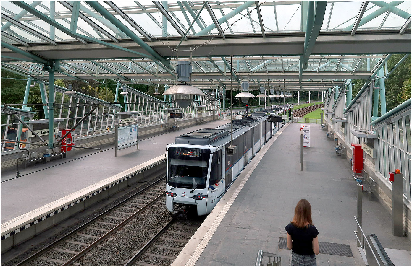 Die stark frequentierte Station Ruhr-Universität wurde besonders aufwändig gestaltet. Die Seitenbahnsteige wurden mit mehren schräg gestellten Glasdächern überdacht.