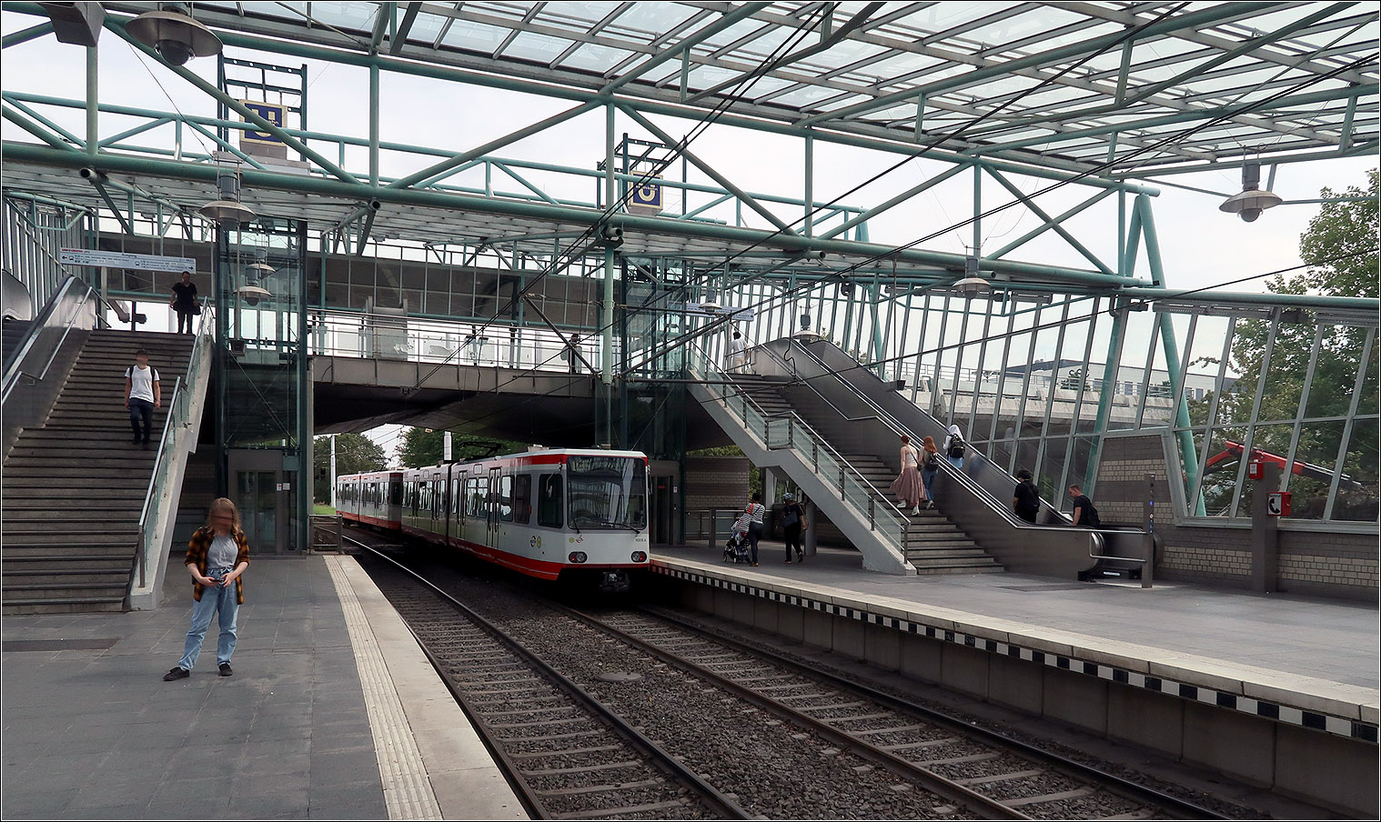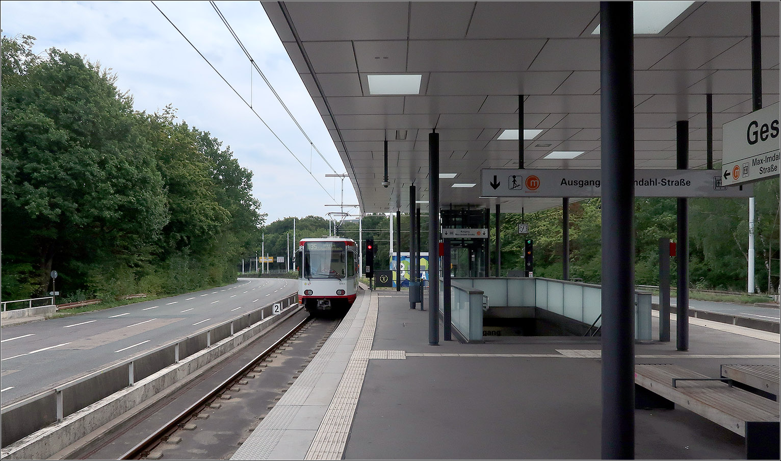 Die U35-Süd in Bochum - Nachträglich eingefügt wurde 2017 die Haltestelle Gesundheitscampus. Die U35 fährt im.Mittelstreifen einer Stadtautobahn. Neben Regenschutz bietet die Überdachung dieser Station auch Schutz vor der Sonne, was bei manchen gläsernen Überdachungen nicht bedacht wird. 22.08.2023 (M)