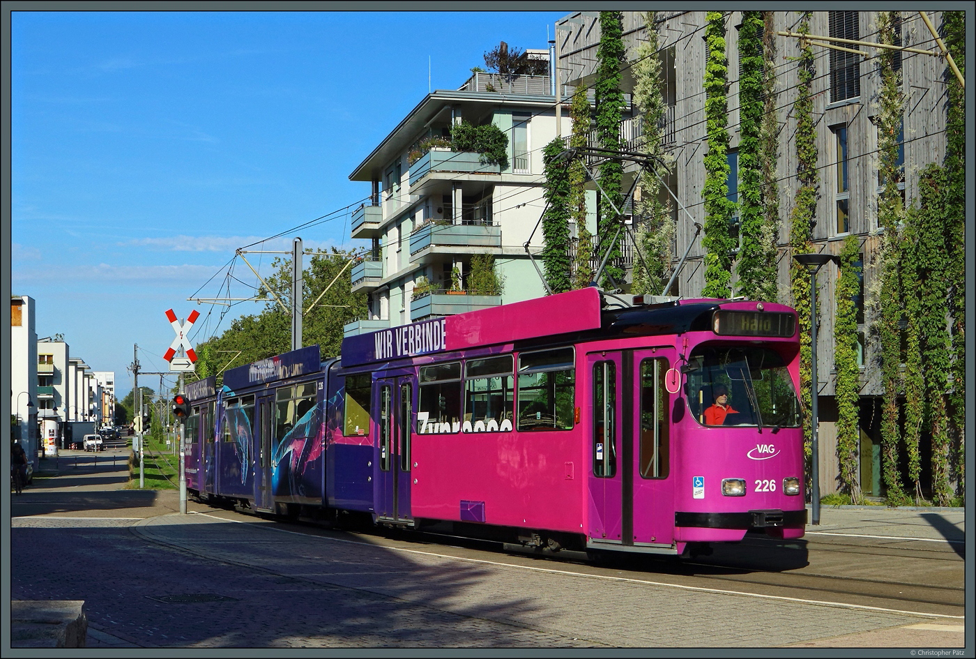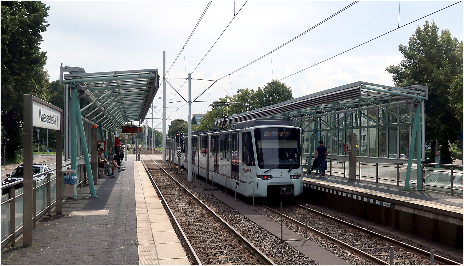 Ein Stadler Tango-Stadtbahnzug verlässt die Haltestelle Wasserstraße und quert die erste von drei Bahnübergängen der Strecke.