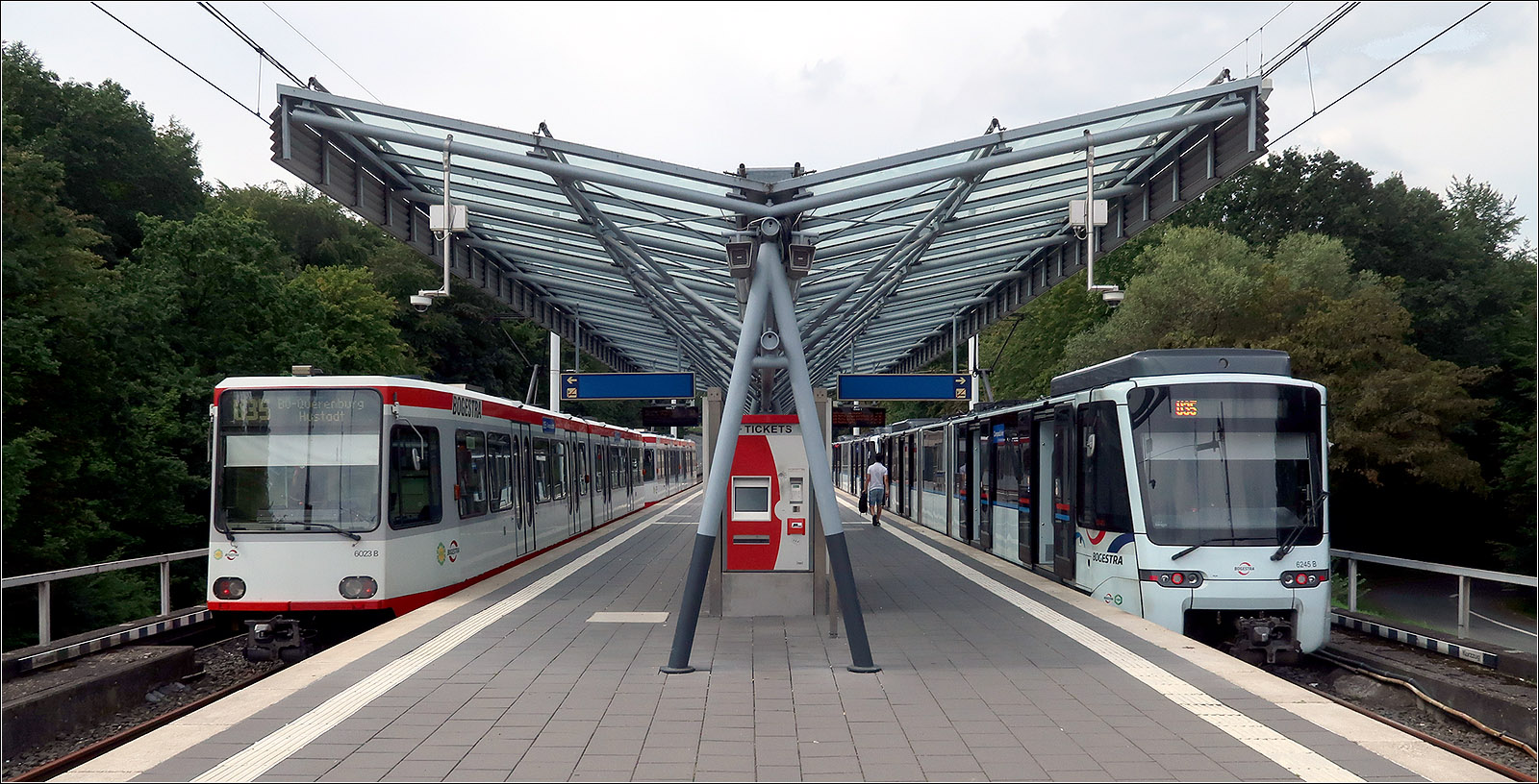 In der Endhaltestelle Hustadt stehen die beiden Bochumer Stadtbahnwagen-Generationen. Links einer der Stadtbahnwagen DÜWAG B80D, die 1988 bis 1993 gebaut wurden. Im Design finden sich Ähnlichkeiten zum Stuttgarter Stadtbahnwagen der 1. Generation, die ebenfalls von DÜWAG gebaut wurden: Ovale Frontscheinwerfer und ovale Türfenster sowie die Inneneinrichtung. Der Bochumer Wagen wirkt aber von vorne gefälliger und schlanker als der Stuttgarter Doppeltriebwagen.