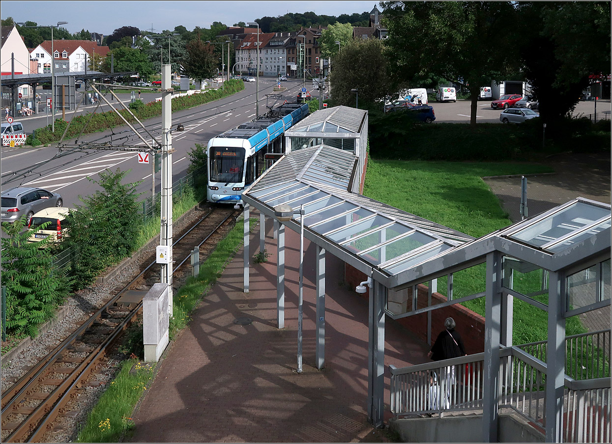 Straßenbahnendpunkt in Hattigen - 1994 wurde die Endstation der Linie 308 in Hattingen neu angelegt. Anstelle der eingleisigen Streckenführung durch das Zentrum entstand eine neue Eigentrasse mit stumpfer Endstelle am damals neuen S-Bahn-Tunnelbahnhof Hattingen Mitte. 2002 wurde dann die Eigentrasse auf einer neuen Brücke auch über die Ruhr hinweg verlängert. Blick von der Fußgängerbrücke auf den Abfahrtsbahnsteig der Linie 308. Der Ankunftsbahnsteig liegt im zweigleisigen Bereich. 22.08.2023 (M)