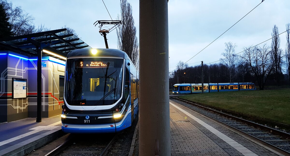 Chemnitz__Skoda 35T[6xNfGlTwZR] 911 und ein 6NGTLDE (Variobahn) auf Linie 5 in der Endschleife Gablenz.__06-03-2024