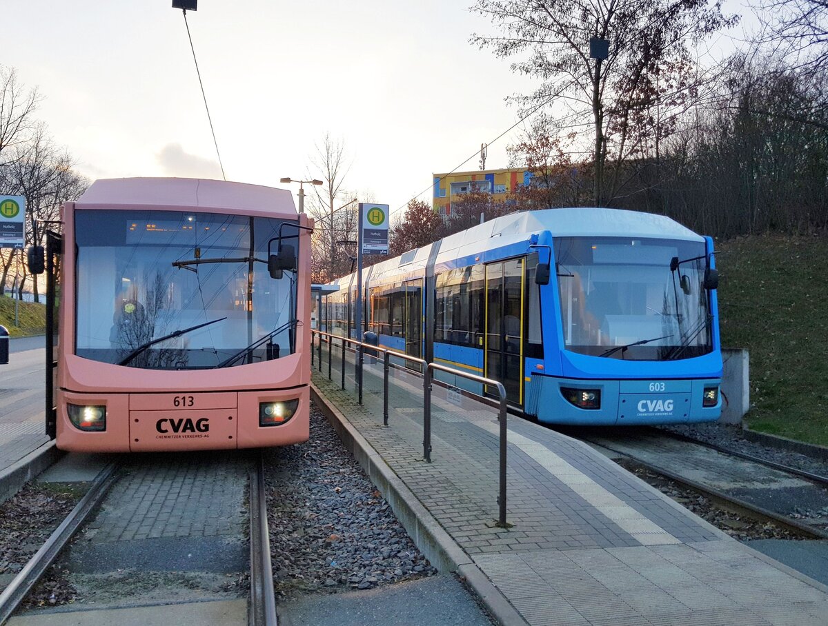 Chemnitz__Zwei Variobahnen 6NGTLDE[Bombardier/ADtranz] 603 und 613 auf Linie 5 in der Endstation'Hutholz'.__06-03-2024