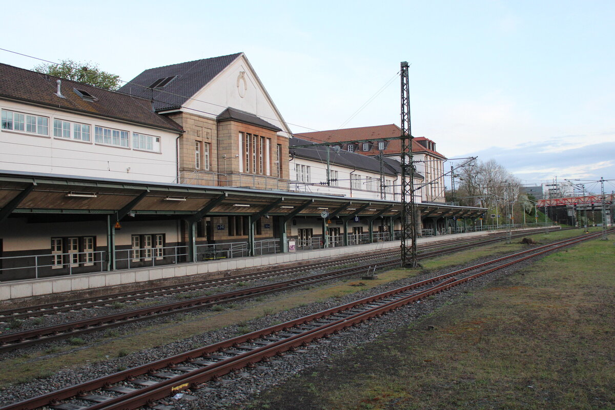 Der außerhalb der Bahnhofshalle gelegene Bahnteig 1 in Darmstadt Hbf, am 03.04.2024.