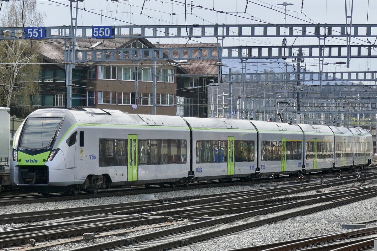 Vereint mit dem Zugteil aus Brig verkehrt der RABe 528 117 "Brig-Glis" wieder weiter als RE1 nach Bern am 5.4.24 nach dem verlassen des Bahnhof Spiez.