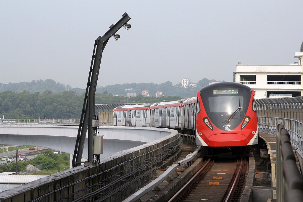 rapidKL MRT-Garnitur 204 (Hersteller: HAP Consortium, Hyundai Rotem + Apex Communications + POSCO Engineering, Type: EMU) Spitzname "Ducky" kreuzt am 12.März 2024 kurz nach der Stesen Sungai Buloh (PY04) in Richtung Kampung Selamat (PY03) fahrend mit der rapidKL MRT-Garnitur 215.