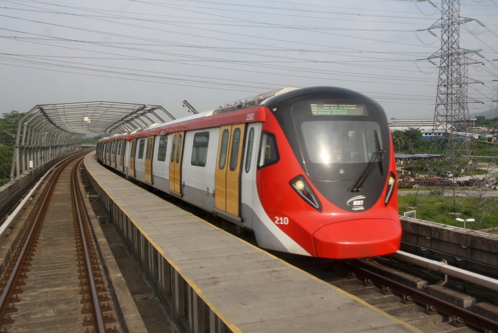 rapidKL MRT-Garnitur 210 (Hersteller: HAP Consortium, Hyundai Rotem + Apex Communications + POSCO Engineering, Type: EMU) Spitzname "Ducky" am 12.März 2024 auf der Putrajaya Line (PY) zwischen den Stesen's Sri Damansara Barat (PY06) und Sri Damansara Damai (PY05).