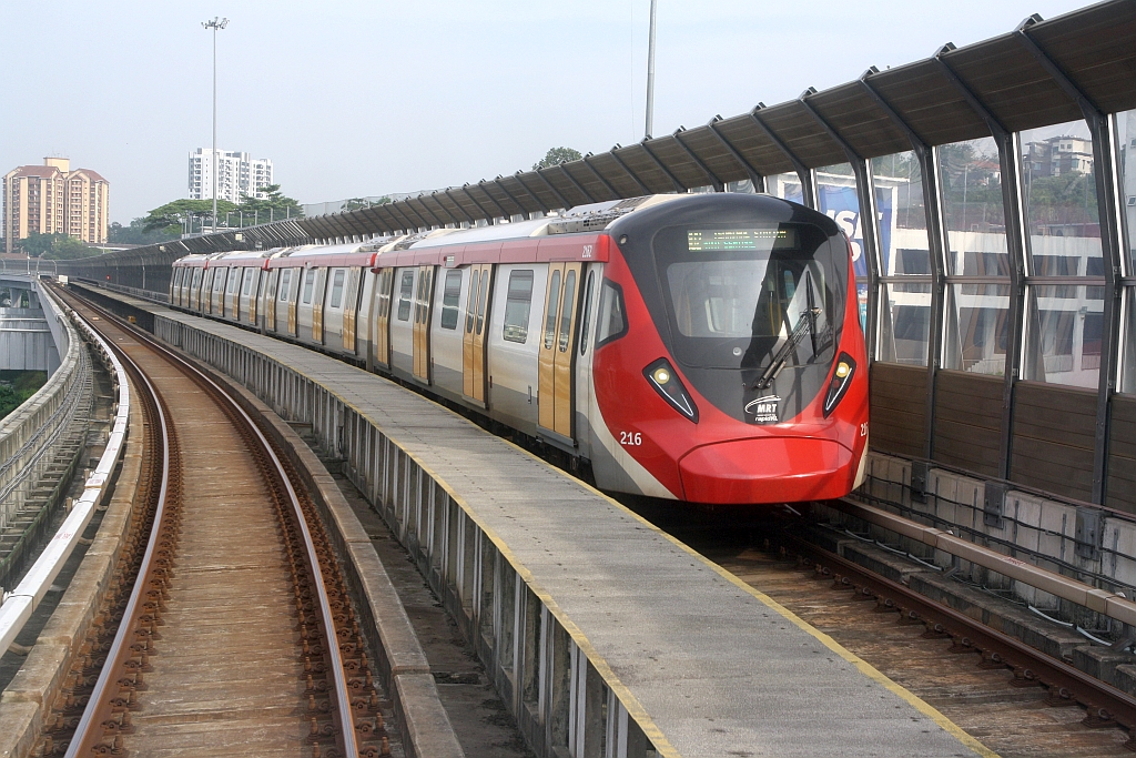 rapidKL MRT-Garnitur 216 (Hersteller: HAP Consortium, Hyundai Rotem + Apex Communications + POSCO Engineering, Type: EMU) Spitzname  Ducky  am 12.März 2024 auf der Putrajaya Line (PY) zwischen den Stesen's Sri Damansara Damai (PY05) und Sungai Buloh (PY04).