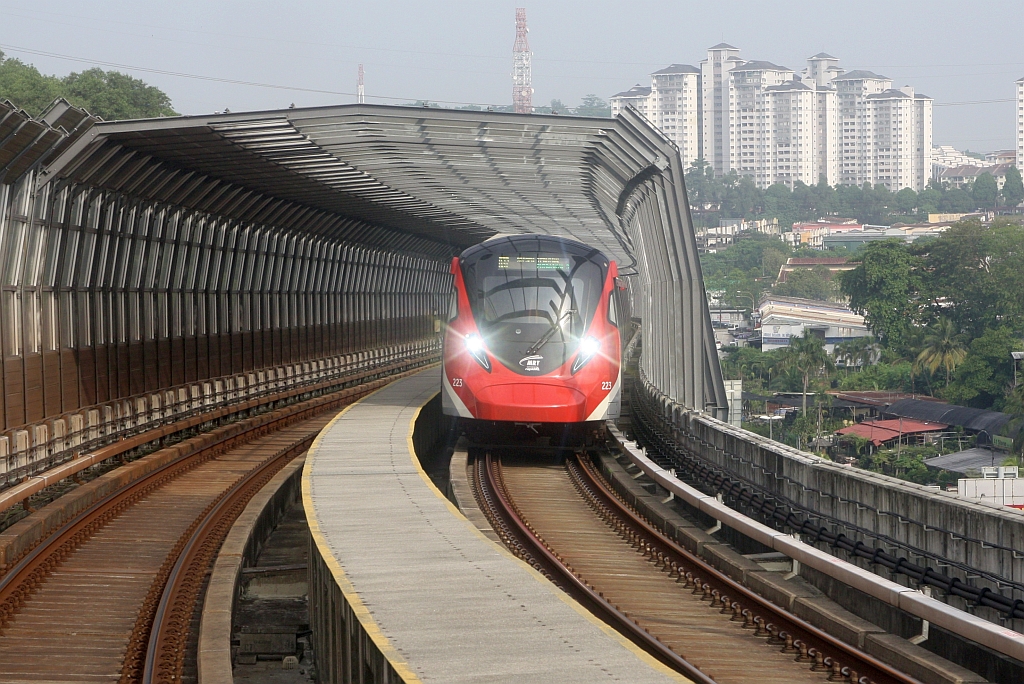 rapidKL MRT-Garnitur 223 (Hersteller: HAP Consortium, Hyundai Rotem + Apex Communications + POSCO Engineering, Type: EMU) Spitzname  Ducky  am 12.März 2024 auf der Putrajaya Line (PY) zwischen den Stesen's Sri Damansara Sentral (PY07) und Sri Damansara Barat (PY06).