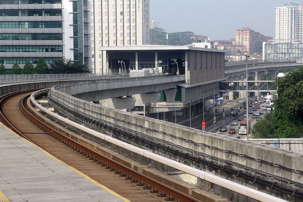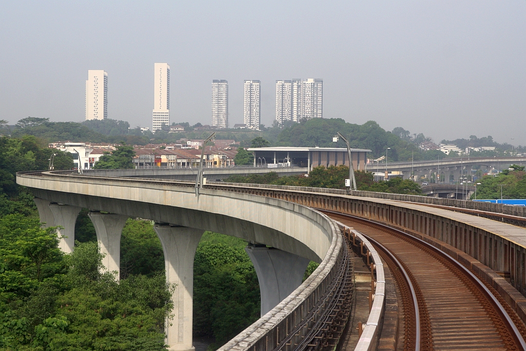 Streckenabschnitt der rapidKL MRT Putrajaya Line (PY) zwischen den Stesen's Sri Damansara Barat (PY06) und Sri Damansara Damai (PY05 - im Hintergrund erkennbar) am 12.März 2024.