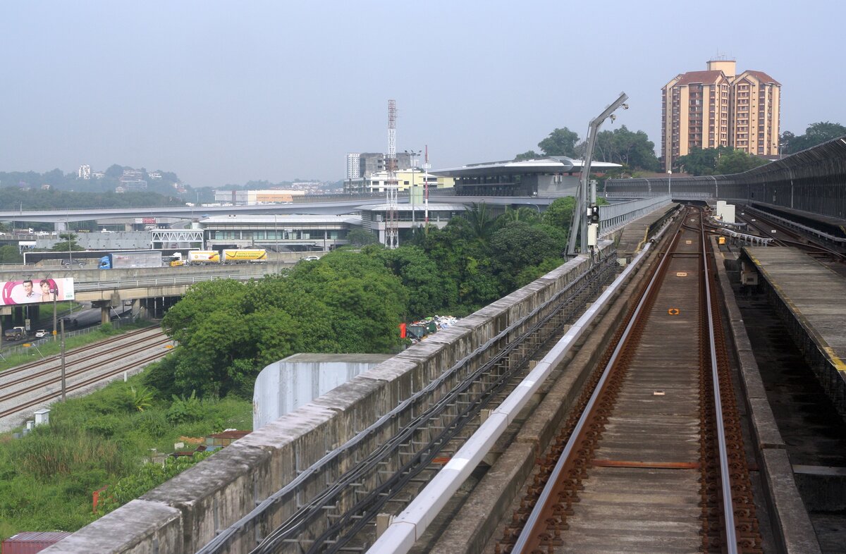 rapidKL MRT-Garnitur 204 (Hersteller: HAP Consortium, Hyundai Rotem + Apex Communications + POSCO Engineering, Type: EMU) Spitzname  Ducky  kreuzt am 12.März 2024 kurz nach der Stesen Sungai Buloh (PY04) in Richtung Kampung Selamat (PY03) fahrend mit der rapidKL MRT-Garnitur 215.