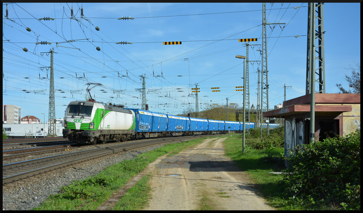 SETG 193 812-5 rollt hier mit einem freundlich grüßenden Lokführer am 06.04.2024 mit einem Ganzzug Containertragen (TWA Snps) in Würzburg um die Kurve. Bei den blauen Kisten handelt es sich um Open-top-Container der Firma Transwaggon für Mercer Holz, die meist mit Hackschnitzeln beladen sind.