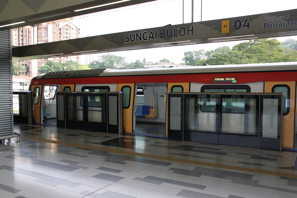 Wagen 2151 als letztes Fahrzeug der rapidKL MRT-Garnitur 215 (Hersteller: HAP Consortium, Hyundai Rotem + Apex Communications + POSCO Engineering, Type: EMU) Spitzname "Ducky" am 12.März 2024 in der Stesen Sungai Buloh (PY04).