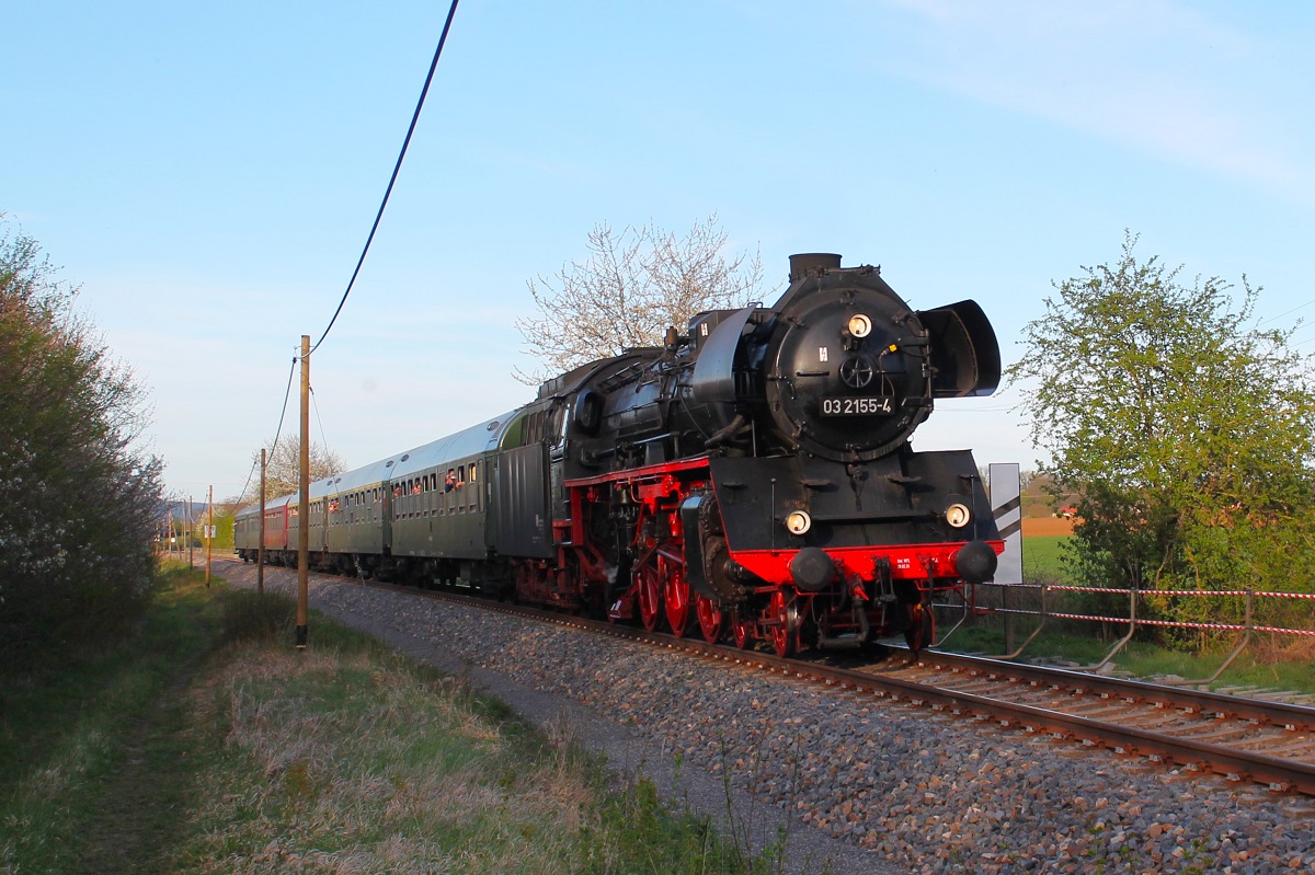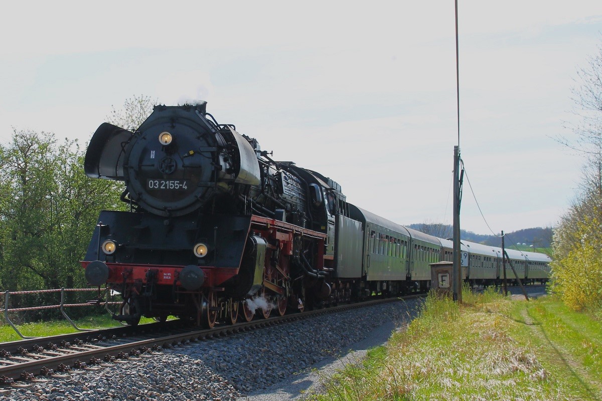 WFL-03 2155-4 ( NVR-Nummer 90 80 00 03 155-3 D-WFL) am 6.4.2024 anlässlich  90 Jahre Schnellzugdampflok 03 155  bei der Durchfahrt durch Pößneck auf dem Rückweg von Gera nach Saalfeld. Der Zug führte an diesem Tag unter anderem eine Rundfahrt von Saalfeld nach Gera und zurück durch.