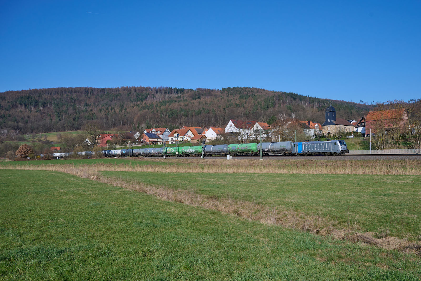 187 346 gehört zu Railpool und ist seit 2020 an die ecco-Rail GmbH vermietet. Am 09.03.2024 zog sie einen Kesselzug durch Melsungen-Schwarzenberg in Richtung Bebra.