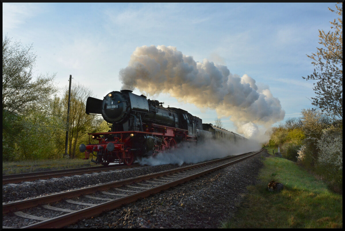 Auf dem Weg nach Dresden: Am 13.04.2024 fuhren die beiden Dampfloks 23 058 (Eurovapor) und 50 3501 (Meininger Dampflokverein, MDV) mit vereinten Kräften und einem Sonderzug von Würzburg und Bad Salzungen zum 16. Dresdner Dampfloktreffen ins Elbflorenz. Im Bahnhof Ritschenhausen trafen die beiden Zugteile am frühen Morgen aufeinander und wurden dort vereinigt. Hier die anschließende Ausfahrt unter Volldampf.