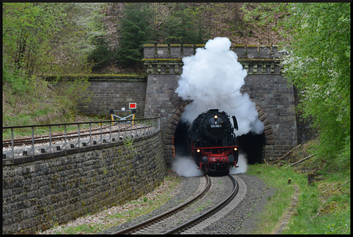 Auf dem Weg nach Dresden: Am 13.04.2024 fuhren die beiden Dampfloks 23 058 (Eurovapor) und 50 3501 (Meininger Dampflokverein, MDV) mit vereinten Kräften und einem Sonderzug von Würzburg und Bad Salzungen zum 16. Dresdner Dampfloktreffen ins Elbflorenz. Hier kommt der Zug aus dem Tunnel am Bahnhof Zella-Mehlis.
