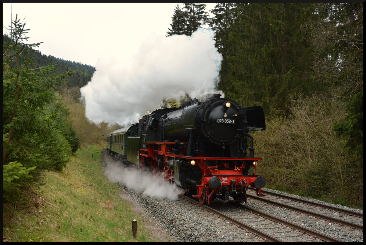Auf dem Weg nach Dresden: Am 13.04.2024 fuhren die beiden Dampfloks 23 058 (Eurovapor) und 50 3501 (Meininger Dampflokverein, MDV) mit vereinten Kräften und einem Sonderzug von Würzburg und Bad Salzungen zum 16. Dresdner Dampfloktreffen ins Elbflorenz. Hier vor kurz dem Bahnhof Oberhof.