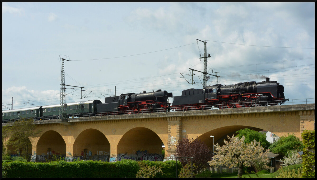 Auf dem Weg nach Dresden: Am 13.04.2024 fuhren die beiden Dampfloks 23 058 (Eurovapor) und 50 3501 (Meininger Dampflokverein, MDV) mit vereinten Kräften und einem Sonderzug von Würzburg und Bad Salzungen zum 16. Dresdner Dampfloktreffen ins Elbflorenz. Hier auf dem Wahrener Viadukt in Leipzig.