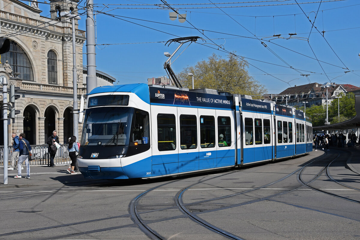 Be 5/6 Cobra 3017, auf der Linie 14, verlässt am 12.04.2024 die Haltestelle beim Bahnhof Zürich.