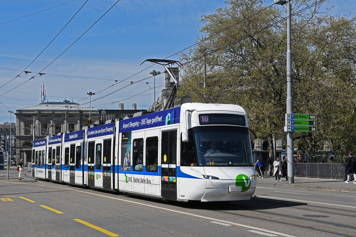 Be 5/6 Cobra 3067 der Glattal Bahn, auf der Linie 10, überquert am 12.04.2024 die Bahnhofbrücke Richtung Haltestelle Central.