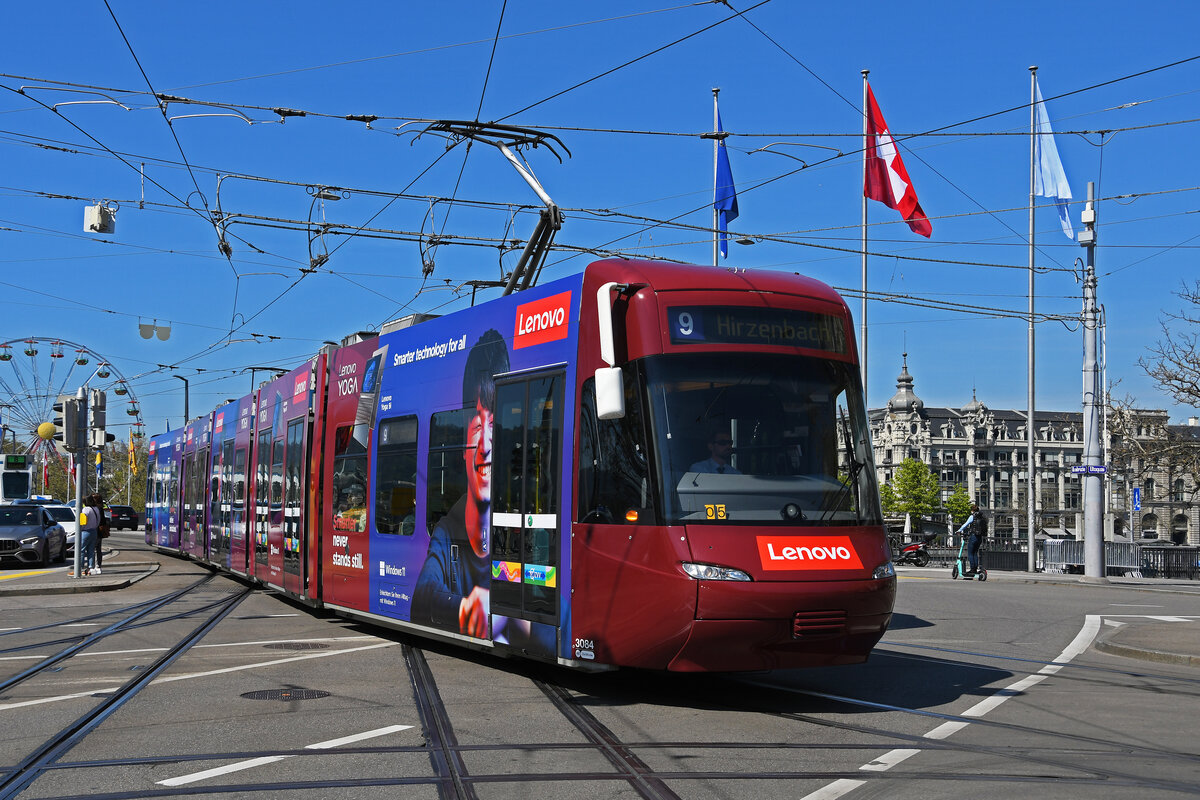 Be 5/6 Cobra 3084 mit der Lenovo Werbung, auf der Linie 9, fährt am 12.04.2024 bei der Haltestelle Bellevue ein.