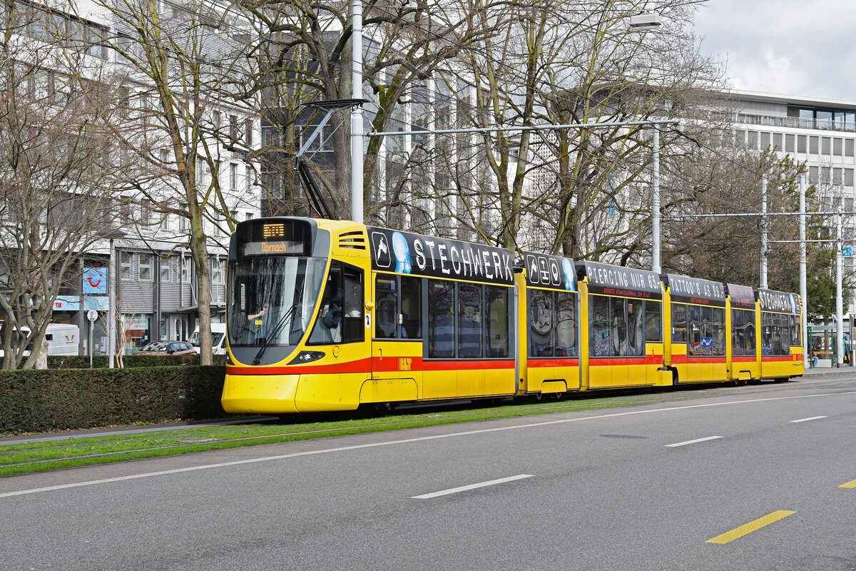 Be 6/8 Flexity 5044, auf der Linie 3, fährt am 19.02.2024 den Steinenberg hoch zur Haltestelle Bankverein.