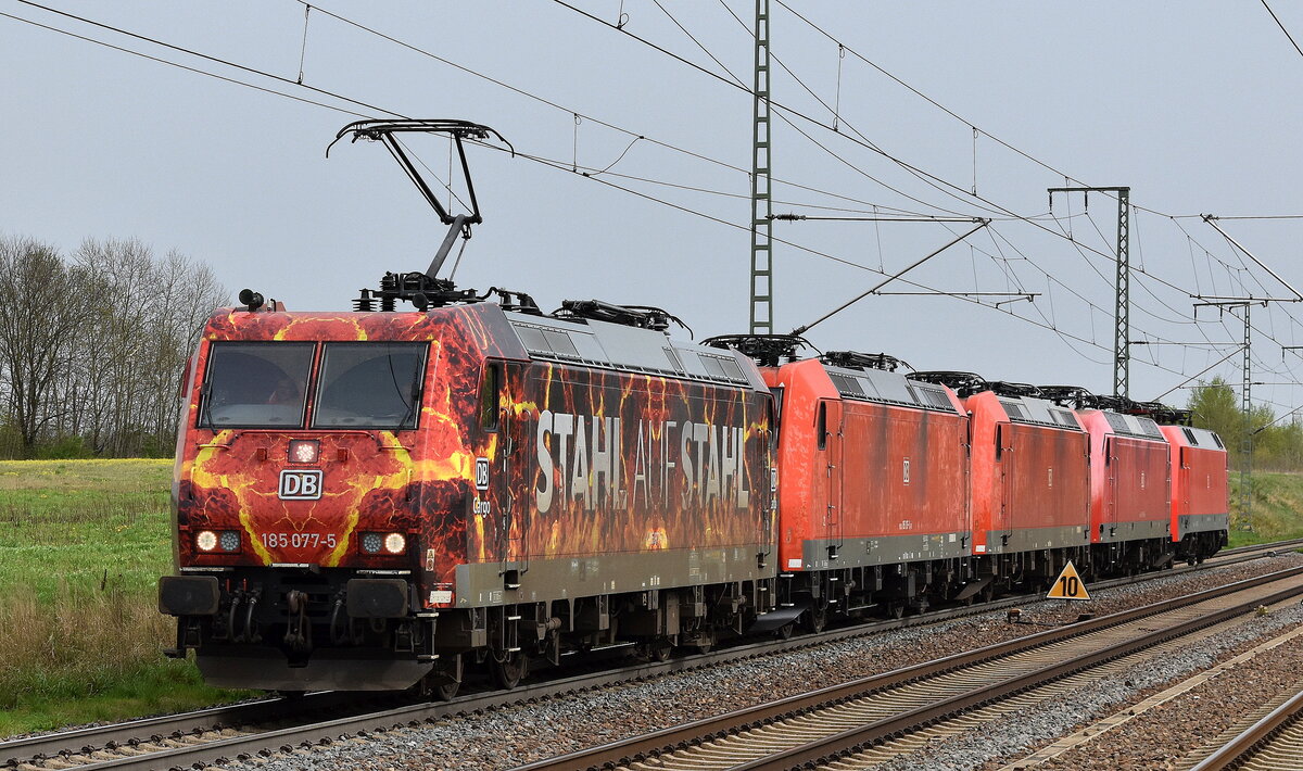 DB Cargo AG, Mainz mit einem interessanten Lokzug, vorne dran die schöne "185 077-5" (NVR: "91 80 6185 077-5 D-DB") mit "185 197-1" (NVR: "91 80 6185 197-1 D-DB") + "185 162-5" (NVR: "91 80 6185 162-5-DB") + "145 005-5" (NVR: "91 80 6145 005-5 D-DB") und am Ende des ZUges "152 006-3" (NVR: "91 80 6152 006-3 D-DB") am 09.04.24 Höhe Bahnhof Rodleben.
