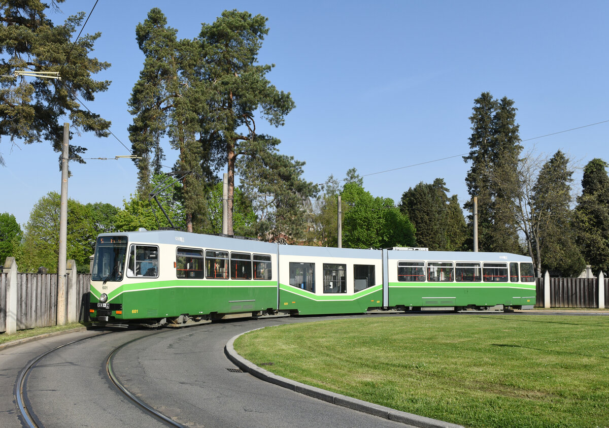 Der 1986 von SGP gebaute, und in den späten 1990er Jahren mit einem Niederflurmittelteil versehene Triebwagen 601 wendete am Morgen des 13. März 2024 als "5er" in der Schleife Zentralfriedhof.