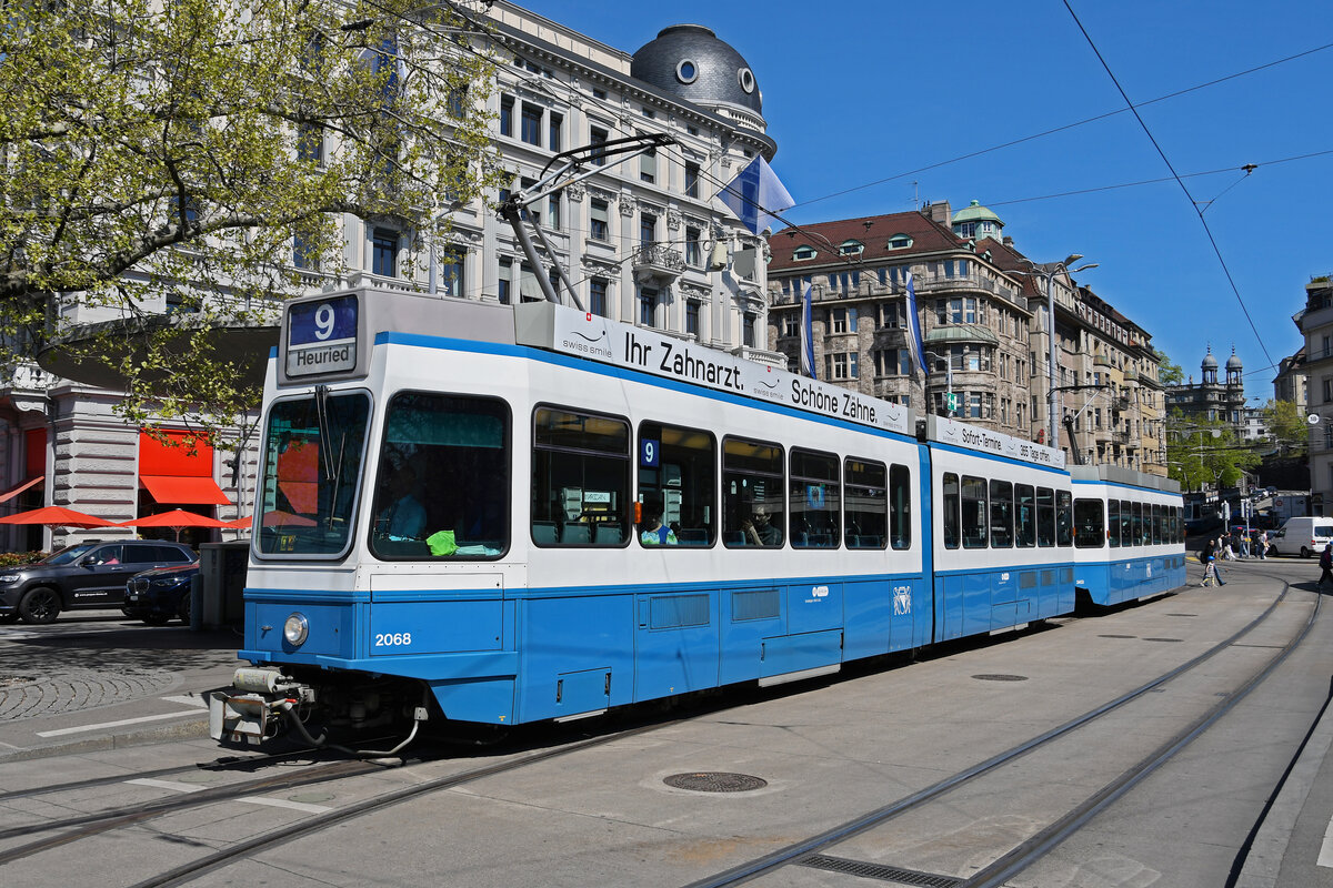 Doppeltraktion, mit dem Be 4/6 2068 und dem Be 2/4 2403, auf der Linie 9, bedient am 12.04.2024 die Haltestelle Bellevue.