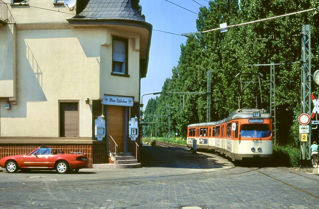 Nürnberg-Fürther Straßenbahn__Tw 356 [GT6; 1966 MAN/Siemens] auf der noch Vorstadt-mäßig wirkenden Würzburger Str. von der Billinganlage kommend mit Fahrtziel 'Bauernfeindstr.'(Das ist dort, wo dieser Tage einige Politiker von einer 4 km langen Magnetschwebebahn phantasieren...).__15-06-1976