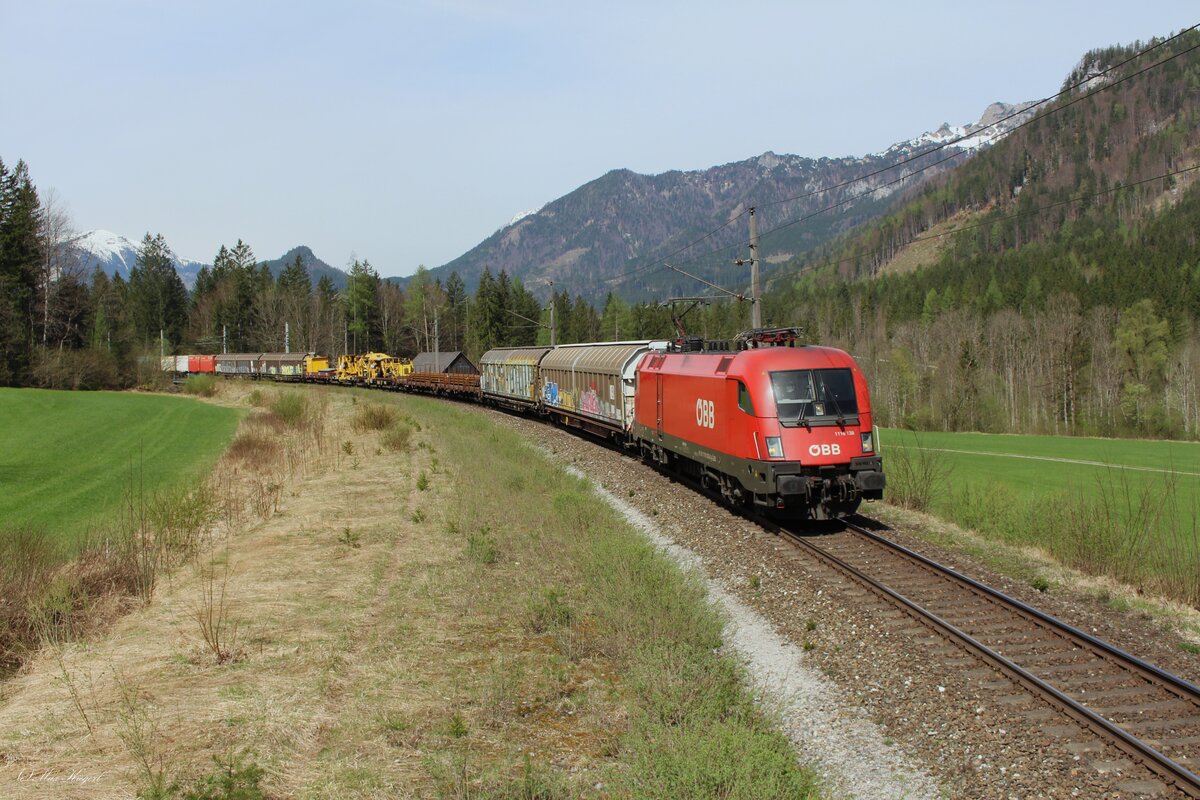 Im ehemaligen Bahnhof Gesäuse Eingang fährt am 8.4.2024 die 1116 138 mit einem gemischten Güterzug von Graz Vbf kommend nach Wien Zvb.