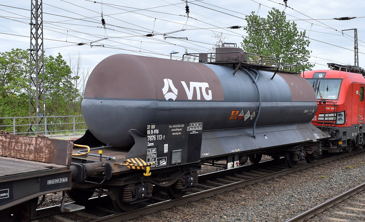 Kesselwagen vom Einsteller VTG mit der Nr. 37 RIV 80 D-VTG 7876 113-7 Zaces lt. UN-Nr.: 46/1381 für das Ladegut Phosphor, weiß oder gelb, trocken, unter Wasser oder in Lösung in einem gemischten Güterzug am 11.04.24 Höhe Bahnhof Saarmund.