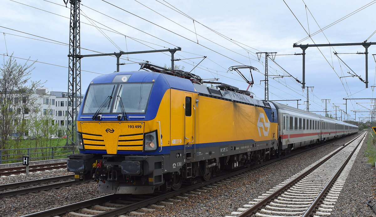 NS - Nederlandse Spoorwegen N.V., Utrecht [NL] mit der ELL Vectron "193 499" [NVR-Nummer: 91 80 6193 499-1 D-ELOC] und DB IC-Wagengarnitur (leer) Richtung Berlin am 11.04.24 Durchfahrt Bahnhof Golm (Potsdam).