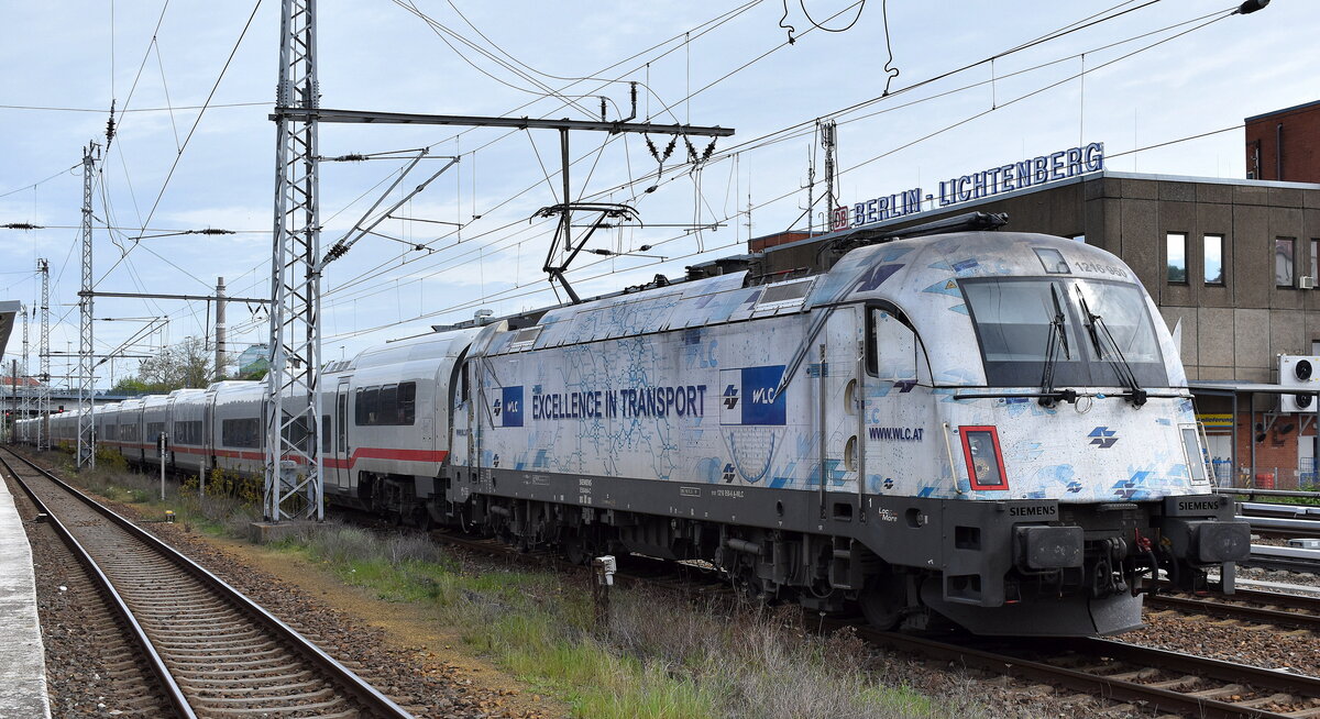 RailAdventure GmbH, München [D] mit dem österreichischen Taurus "1216 950" [NVR-Nummer: 91 81 1216 950-6 A-WLC] bei der Überführung eines neuen ICE L vom Hersteller Talgo, es ist ein lokomotivbespannter Wendezug der DB Fernverkehr AG für den Intercity-Express-Verkehr beim Halt auf dem Durchfahrtgleis Bahnhof Berlin Lichtenberg am 11.04.24