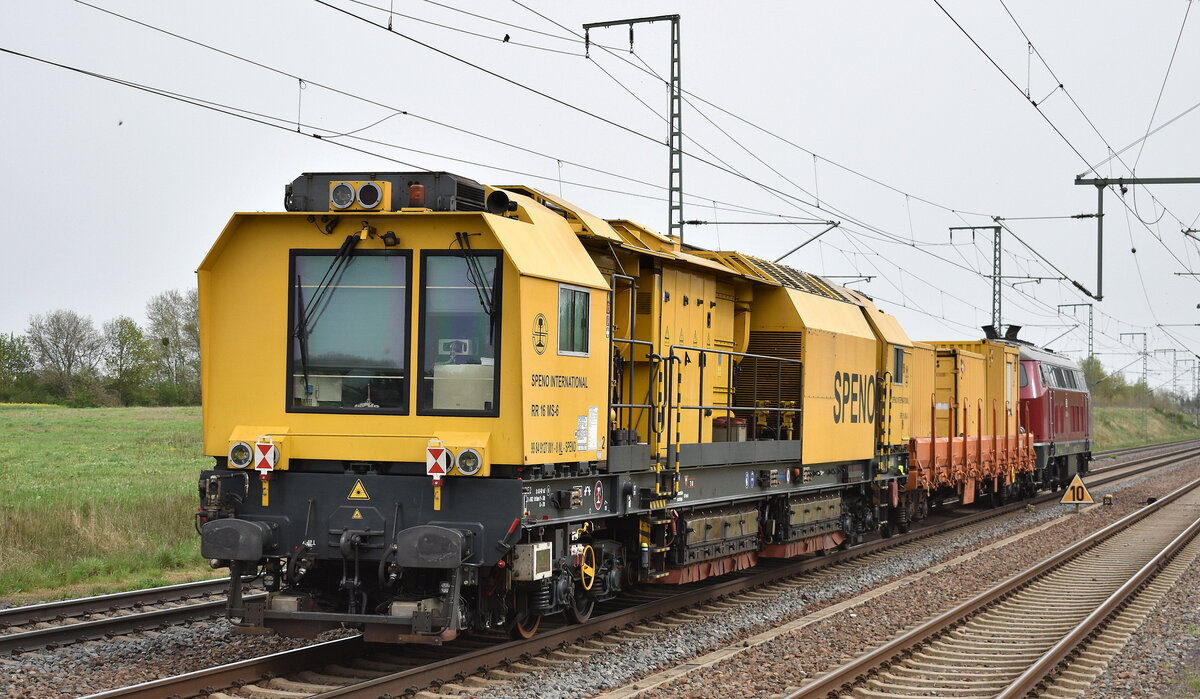 Schienenschleifzug SPENO INTERNATIONAL Typ RR 16 MS-6 mit niderländischer Registrierung (99 84 9127 001-8 NL-SPENO) am Haken von 218 155-0 am 09.04.24 Höhe Bahnhof Rodleben.