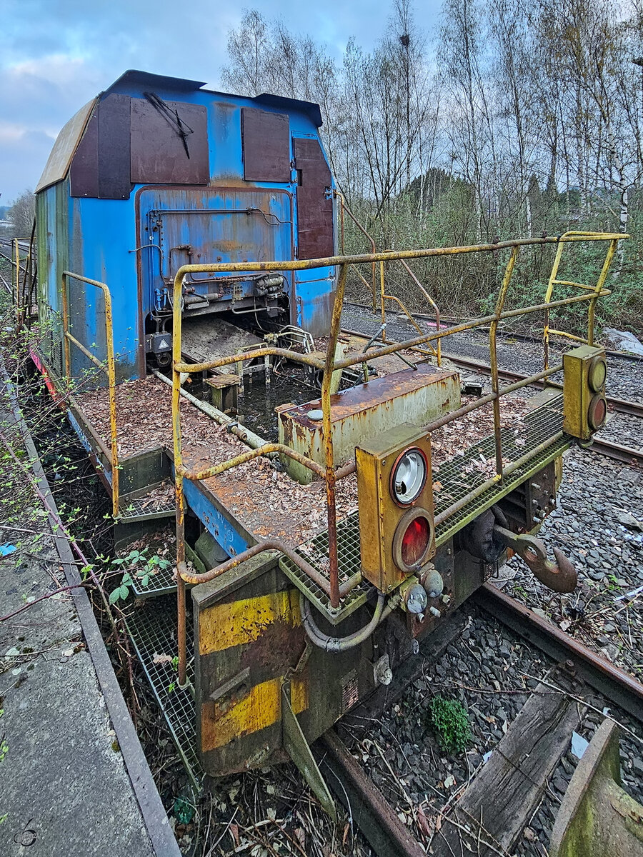 Überreste einer Diesellokomotive der Verkehrsbetriebe Peine Salzgitter, so gesehen im März 2024 in der Nähe des Hattinger Bahnhofes.