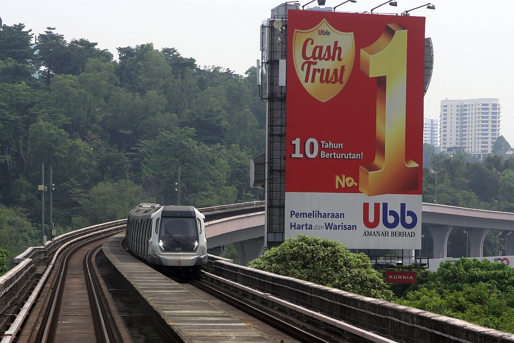 Winzig im Vergleich zu den mächtigen Werbeflächen erscheint die rapidKL MRT-Garnitur 134 (Hersteller: Siemens/CSR Nanjing Puzhen / SMH Rail, Type: Siemens Inspiro) Spitzname "The Guiding Light". - Bild am 12.März 2024 auf der Kajang Line (KG) zwischen den Stesen's Phileo Damansara (KG12) und Pusat Bandar Damansara (KG13).