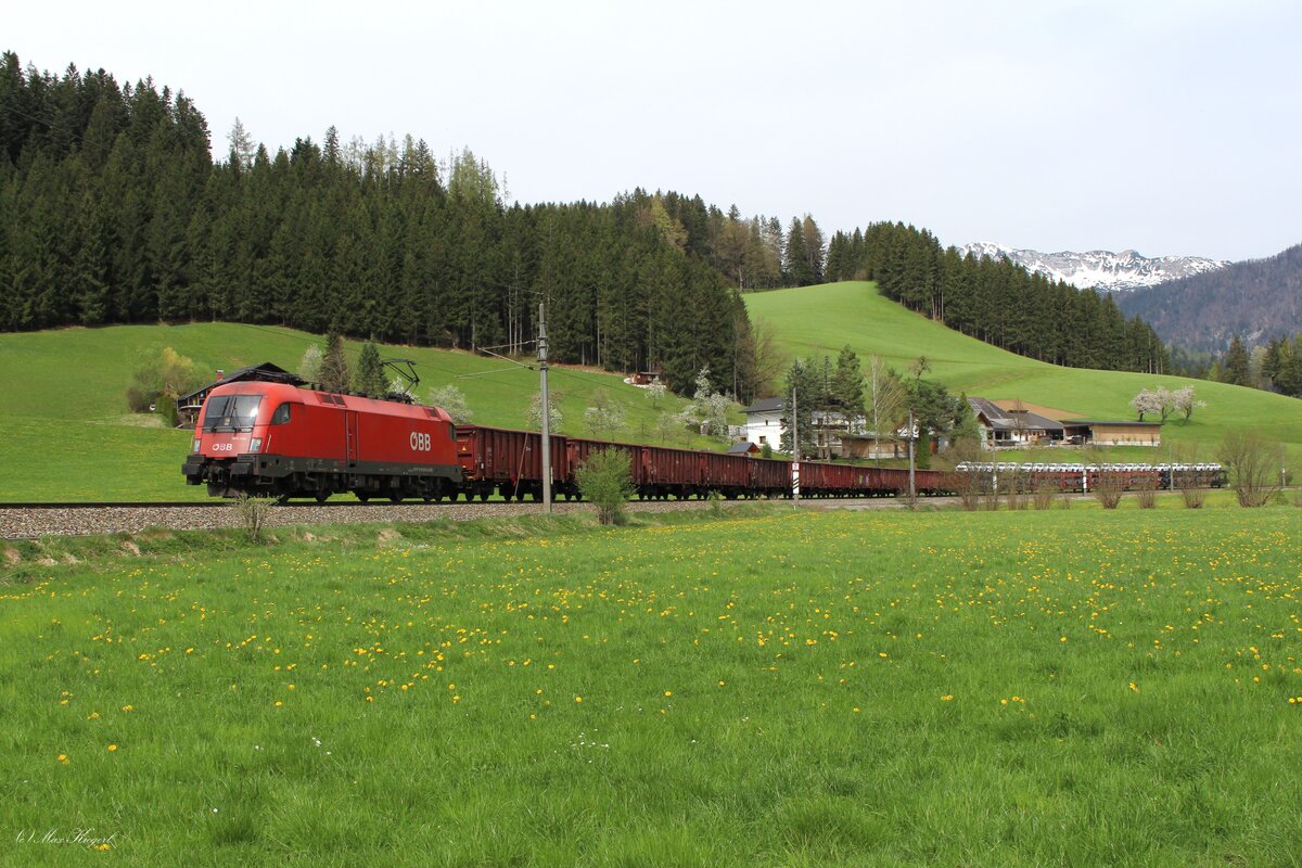 Zwischen Windischgarsten und Spital am Pyhrn fährt die 1016 024 am 8.4.2024 mit einem gemischten Güterzug von Wien Zvb nach Villach Süd Gvbf.