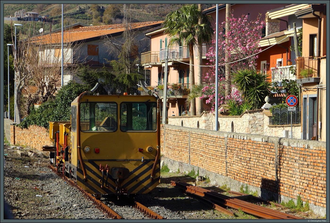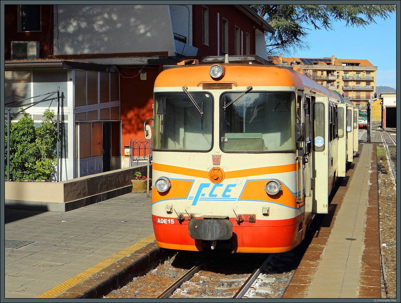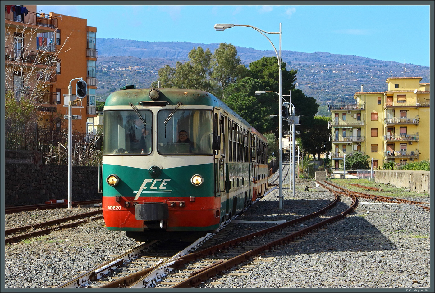 Die Triebwagen ADe 20 und 15 der FCE erreichen am 26.02.2024 den Endbahnhof Riposto. Der Abschnitt Riposto - Randazzo der FCE wird aktuell lediglich von 3 Zugpaaren befahren, die hauptsächlich dem Schülerverkehr dienen.