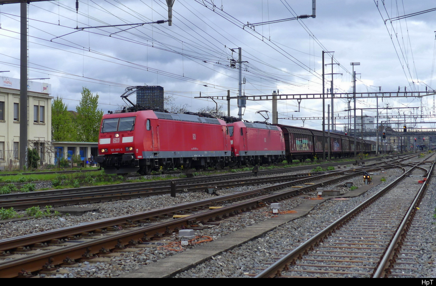 DB - Loks 185 085-8 + 185 099-9 mit Güterzug unterwegs in Pratteln am 02.04.2024 .. Standort des Fotografen ausserhalb der Geleisanlagen