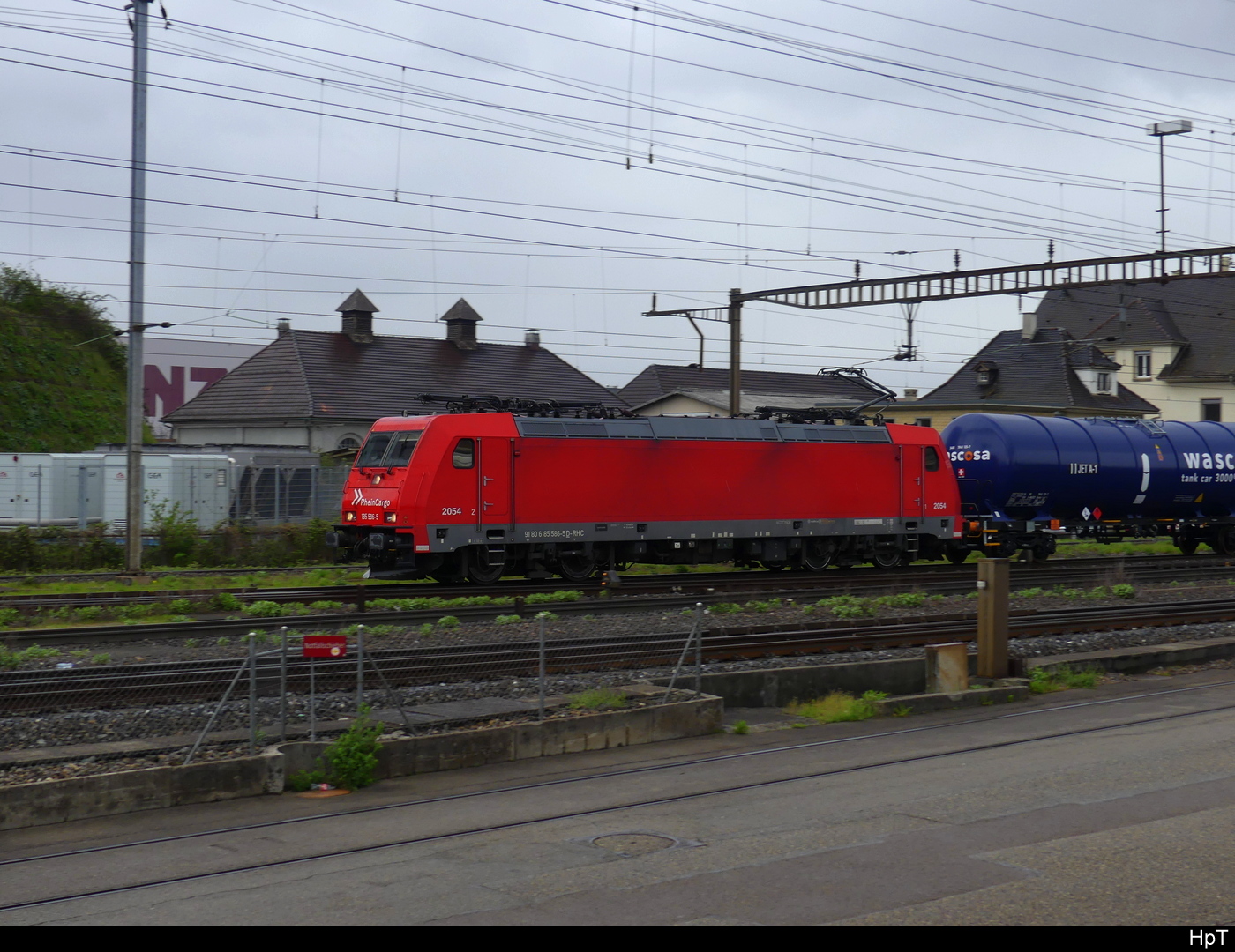 RHC - 91 80 6 185 586-5 mit Güterzug im Regen unterwegs in Pratteln am 02.04.2024 .. Standort des Fotografen ausserhalb der Geleisanlagen
