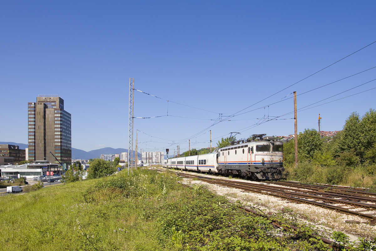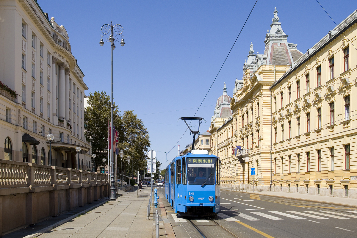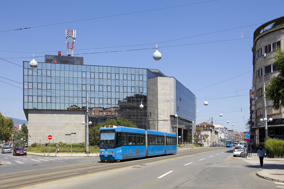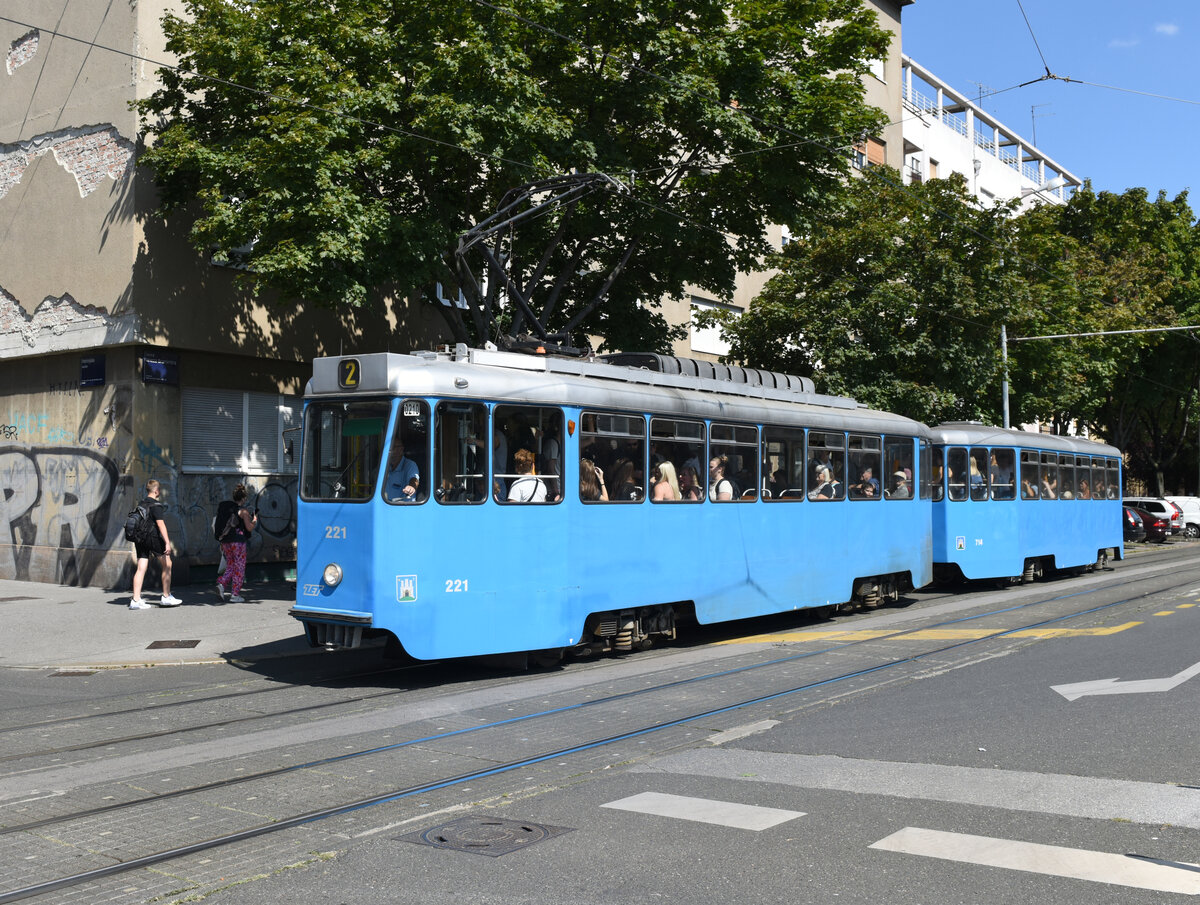 In den 1970er Jahren wurden von Đuro Đaković in Slavonski Brod die vierachsigen Triebwägen der Baureihe TMK 201 gebaut. Am Mittag des 12. September 2023 war TMK 221 samt Beiwagen 714 auf der Line 2 nach Črnomerec unterwegs und wurde dabei von mir auf der Ulica Kneza Branimira fotografiert.