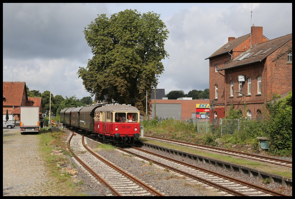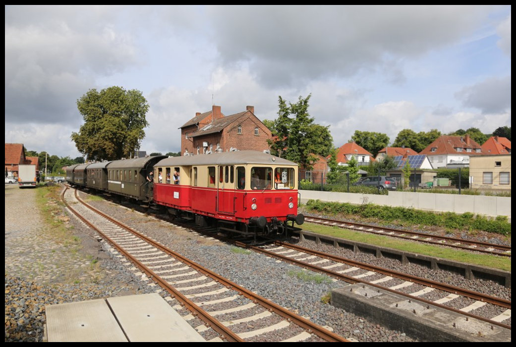 Am 4.8.2024 war endlich nach vielen Jahren der Streckenstilllegung wieder ein Museumszug von Eisenbahn Tradition von Lengerich nach Bad Laer unterwegs. Der Schlepptriebwagen VT 03 hatte mit Zug Nr. 910 vier gut besetzte Donnerbüchsen am Haken. Hier hält der Zug gerade um 10.50 Uhr planmäßig im Bahnhof Bad Iburg. Das hinter dem Zug erkennbare ehemalige Bahnhofsgebäude ist leider nicht mehr als solches in Betrieb.