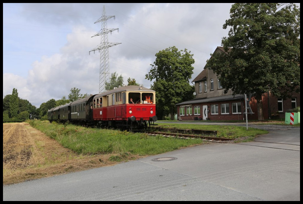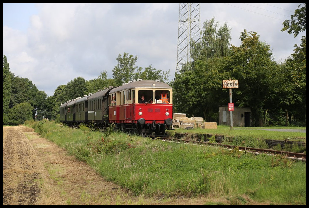 Am 4.8.2024 war endlich nach vielen Jahren der Streckenstilllegung wieder ein Museumszug von Eisenbahn Tradition auf der TWE Strecke von Lengerich nach Bad Laer unterwegs. Der Schlepptriebwagen VT 03 hatte mit Zug Nr. 910 vier gut besetzte Donnerbüchsen am Haken. Hier passiert die Garnitur gerade um 10.20 Uhr den ehemaligen Bahnhof Höste. Die alte Bahnsteigkante in Form von Holzbohlen ist noch immer vorhanden.