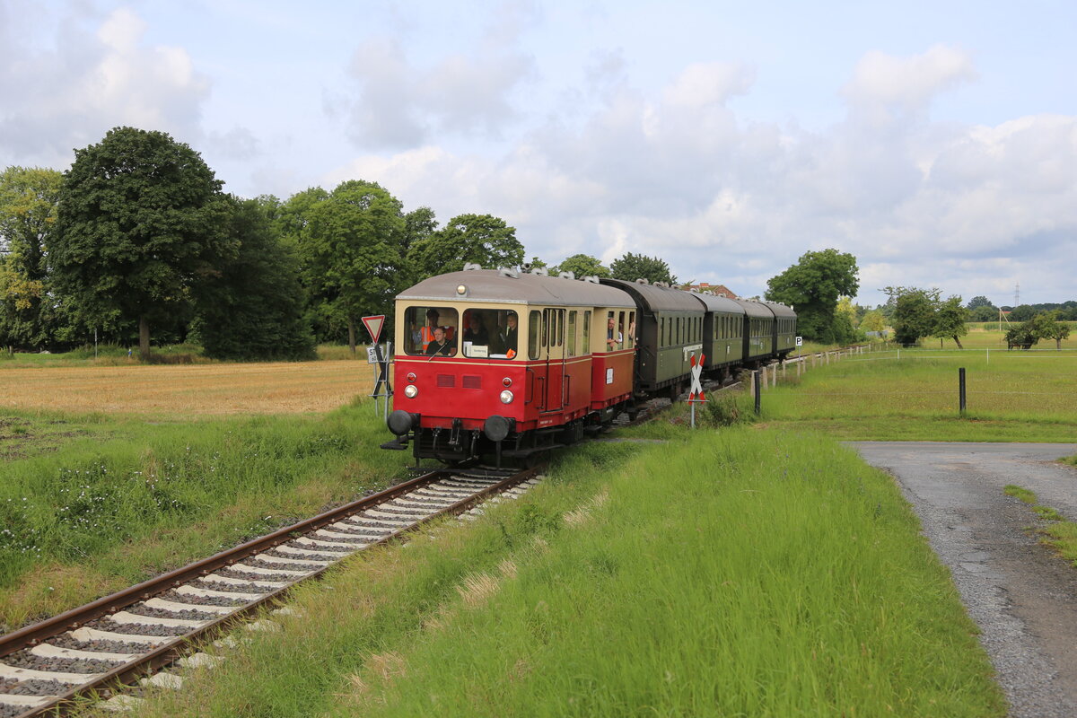Am 4.8.2024 war endlich nach vielen Jahren der Streckenstilllegung wieder ein Museumszug von Eisenbahn Tradition von Lengerich nach Bad Laer unterwegs. Der Schlepptriebwagen VT 03 hatte mit Zug Nr. 910 vier gut besetzte Donnerbüchsen am Haken. Hier ist die Garnitur zwischen Lengerich und Lienen um 10.20 Uhr in der ländlich idyllischen Landschaft unterhalb des Teutoburger Waldes unterwegs, der die Strecke auch ihren Namen Teutoburger Wald Eisenbahn verdankt.